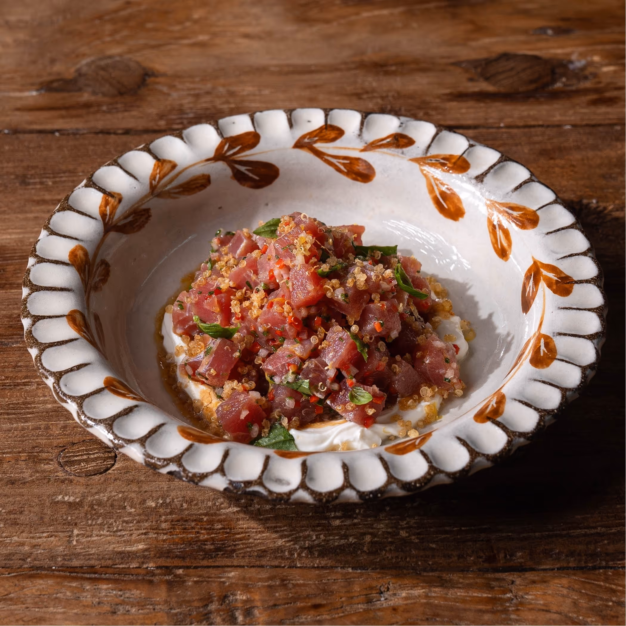 A Blue Fin Tuna on a bed of Labneh, finished with crispy quinoa and a homemade raspberry molasses.