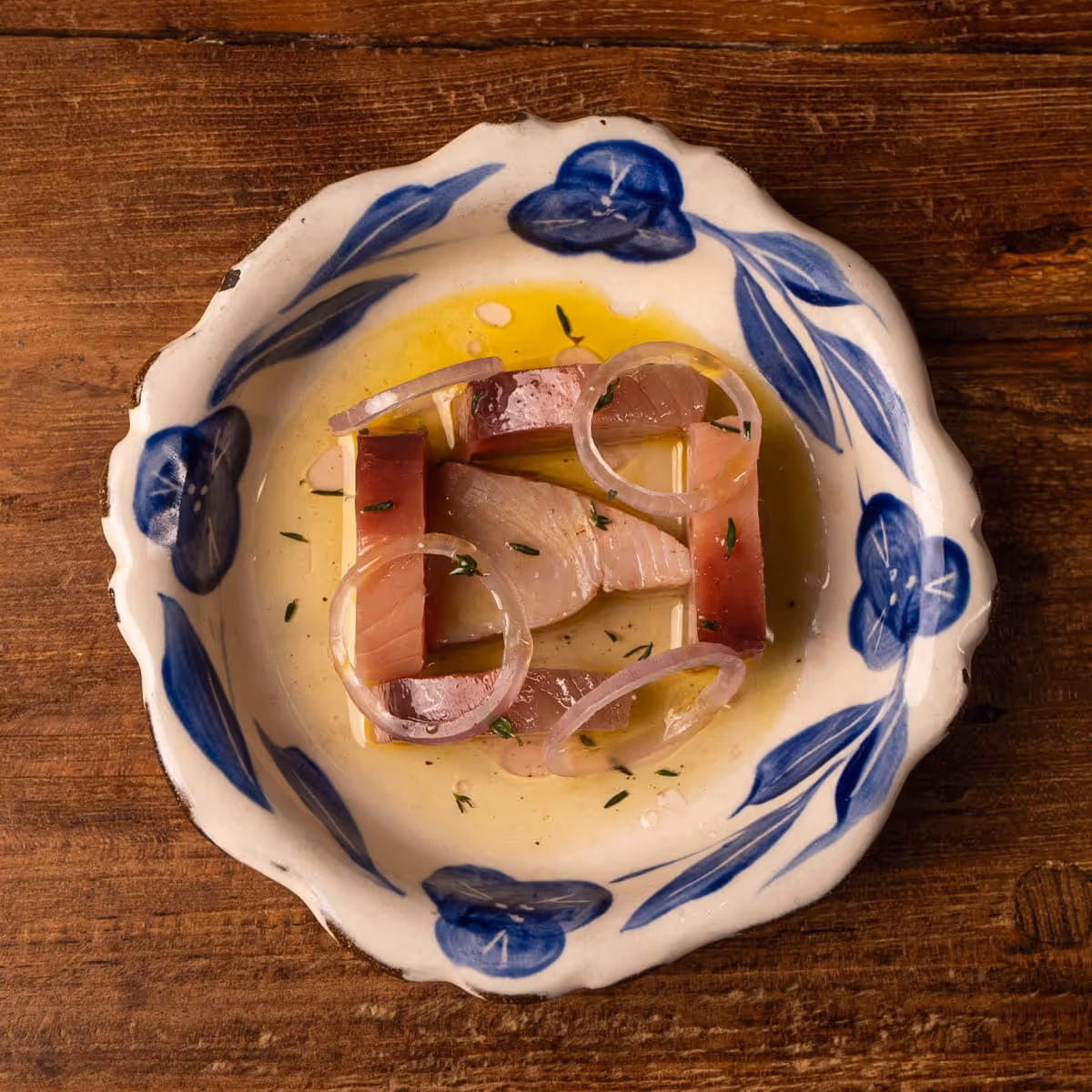 Black Sea Pan Fried Bonito served with fresh rocca , onion and lemon wedges